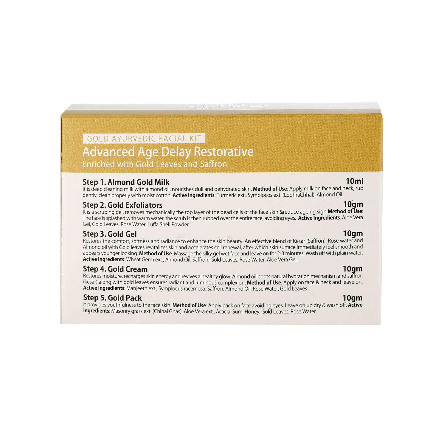 Gold Facial Kit helps to brighten the dull complexion of the skin with beautiful glow. The main ingredient of the products is Gold leaves and saffron which slows down the collagen depletion, increases skin’s elasticity, stimulates the cells making process so that the skin appears firm. Regular use of these products improves blood circulation and prevents premature aging, wrinkles and develops a permanent glow on the skin.